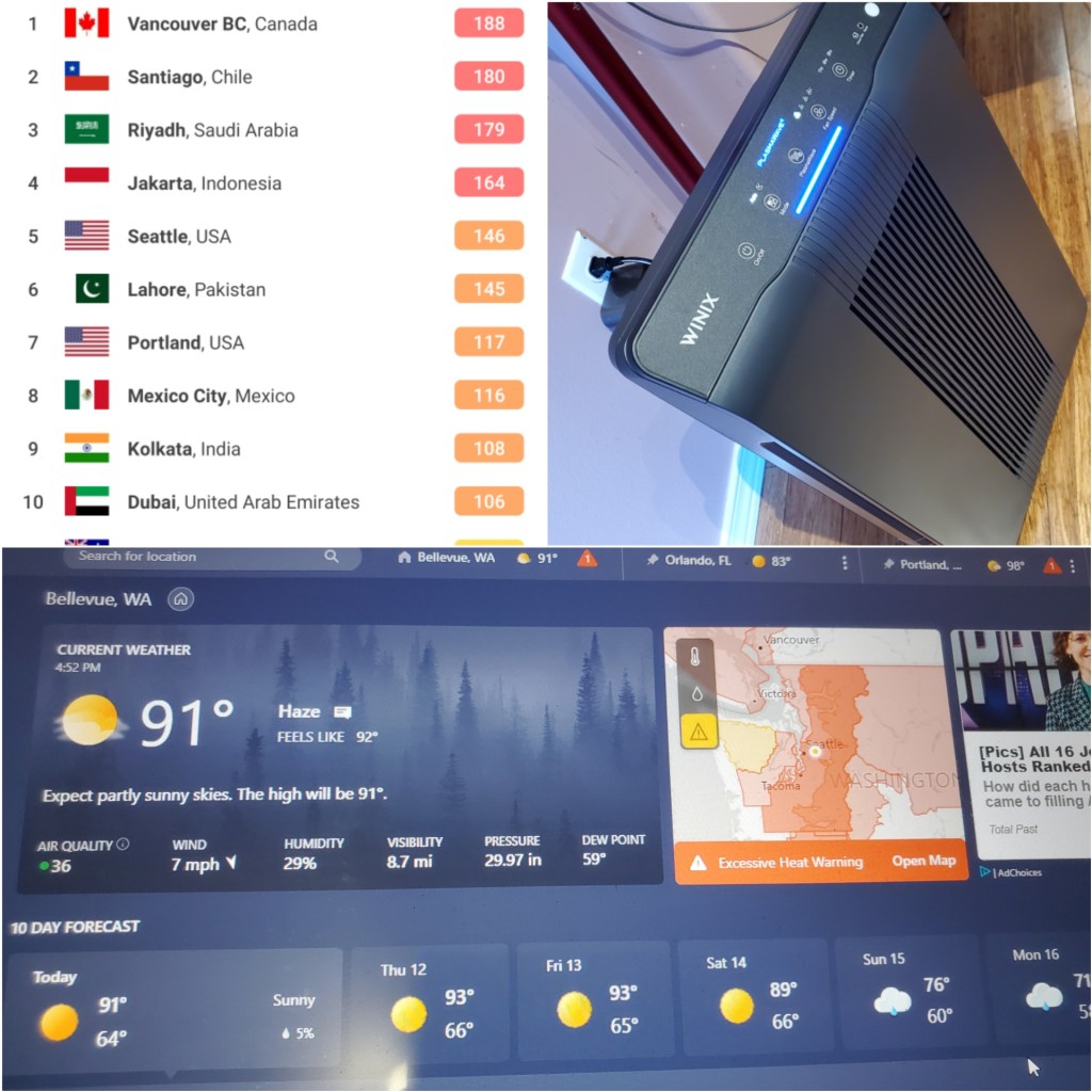 근데 오시면서 혼자 오면 심심하니 화씨로 90도 넘는 -물론 지난 번 Heat Wave보단 덜하지만- 또 하나의 역대급 더위와 함께 오셨다.. 그리고 아니나 다를까 올래면 가오가 있지 싶은지.. 이동네 캐스케이드 삼형제 (벤쿠버-시애틀-포틀랜드) 대략 세계 랭킹 순위군 등극시켜주시고…