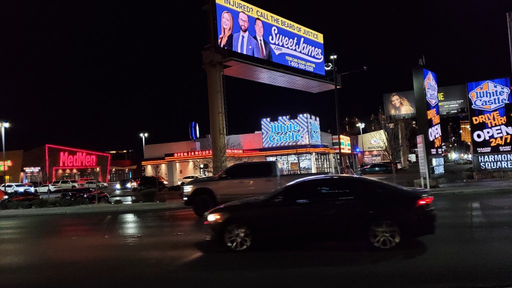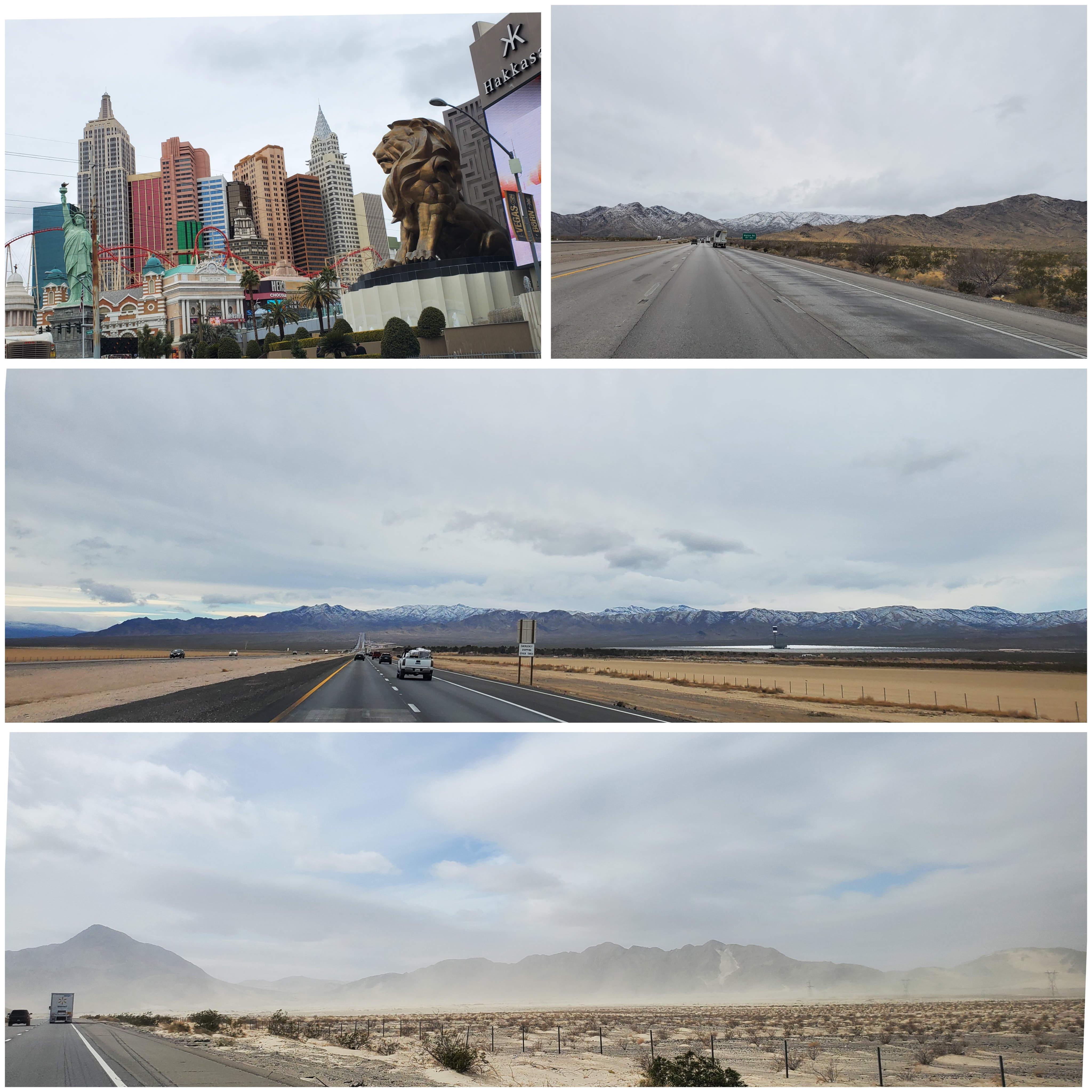 First was after spending all night by walking the entire strip and I was a shot-gun so half sleeping :). Second was the time when the entire sceneries was covered with snow. and Last time I was simply driving at night to LA so all I remember is full darkness.