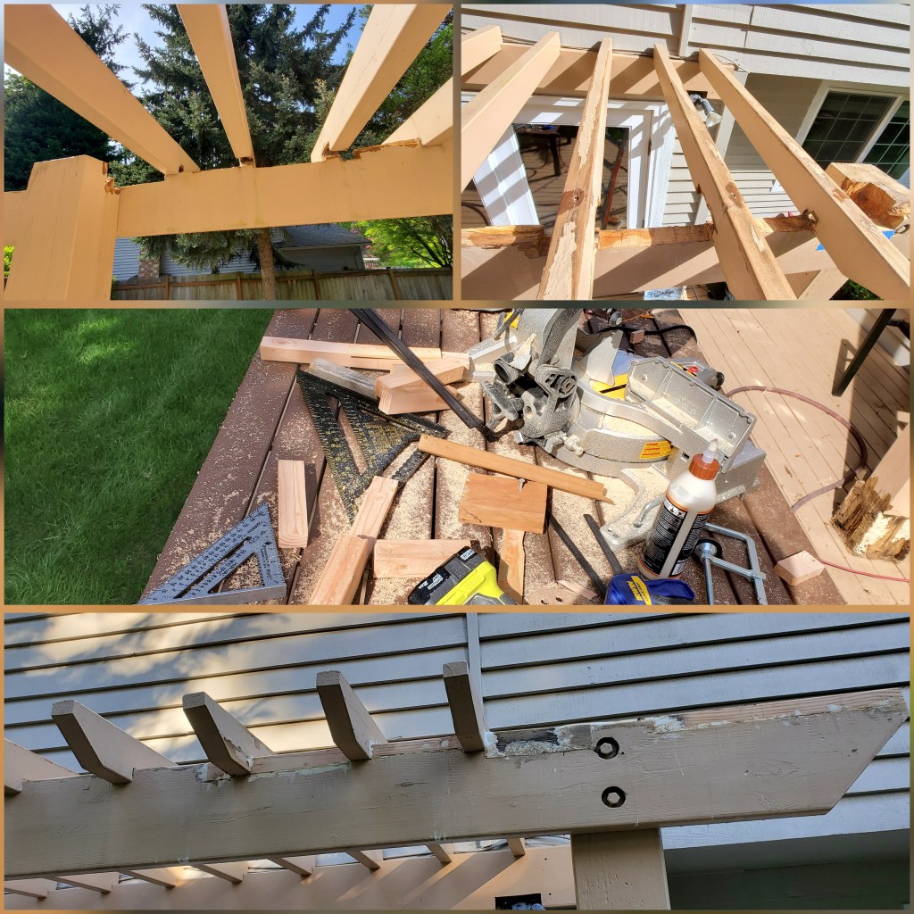 This was another tough series of tasks as it required some physics as it required some estimation of which part of healthy post carries the load and wiggling of the post to find the room to pull out rotten boards and insert new boards and re-adjust the post’s location to spread the loads to newly installed boards.