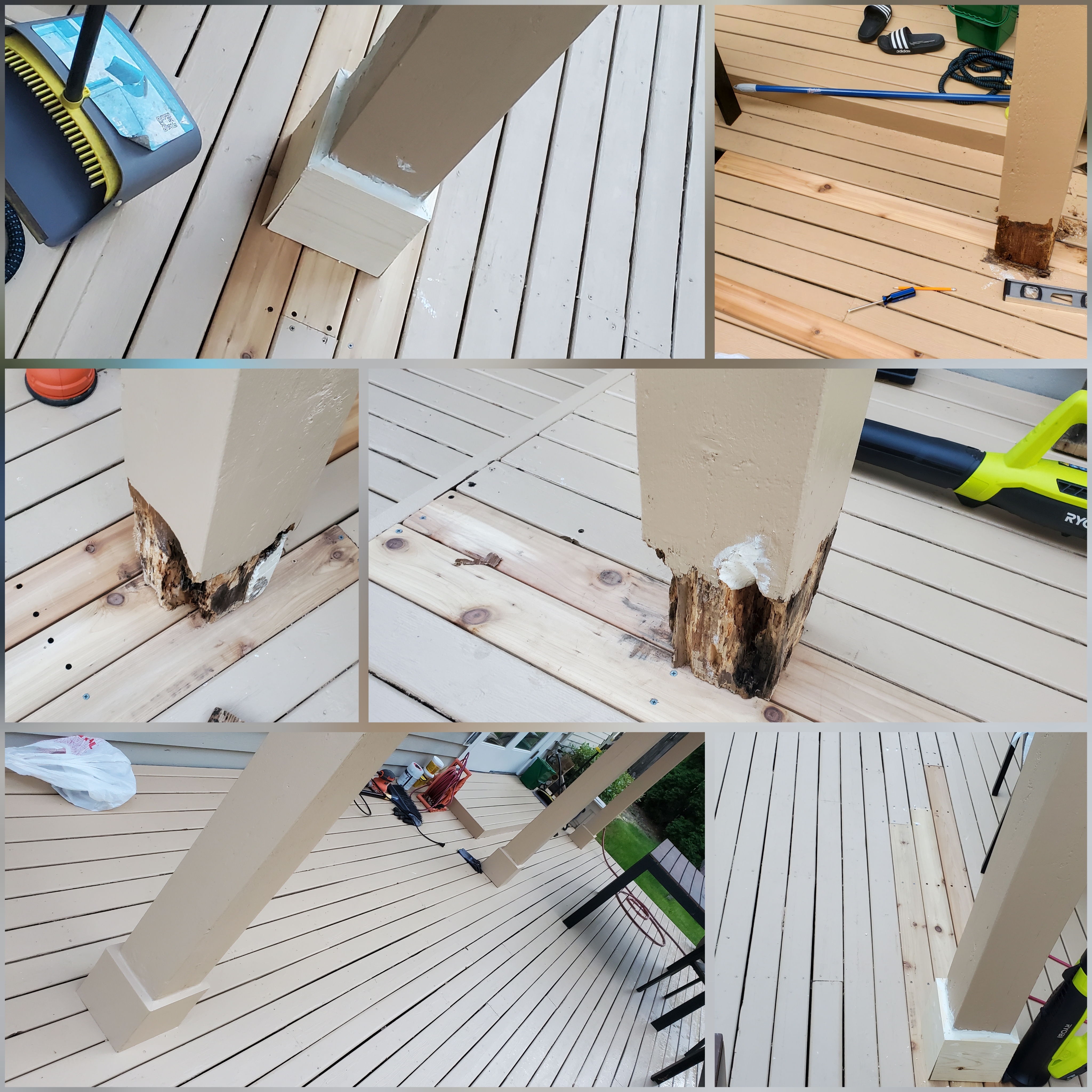 ๊ฒฐ๊ตญ ํฌ์คํธ ๊ธฐ๋ฅ ๋ฐ์ board๋ฅผ ๊ต์ฒดํ๊ณ post ๋ฐ๋ถ๋ถ ์ค ์ฉ์ ๋ถ๋ถ์ ๋๋ ค๋ด๊ณ ๋ณด๊ฐํ ํ post ํ๋จ๋ถ moulding์ ์ธ ๊ฐ ๋ชจ๋ ๊ต์ฒดํ๊ธฐ๋ก ๊ฒฐ์ ํ๊ณ ๋ค์ Lowes๋ก ๋ฐ์ด๊ฐ ๋๋ฌด ์ฌ์ค๊ณ ์จ๊ฐ ๋๊ตฌ๋ค์ ๋ค์ deck์ผ๋ก ์ํ ๋ ธ๊ฐ๋ค๋ฅผ ์์ํ๋ค..