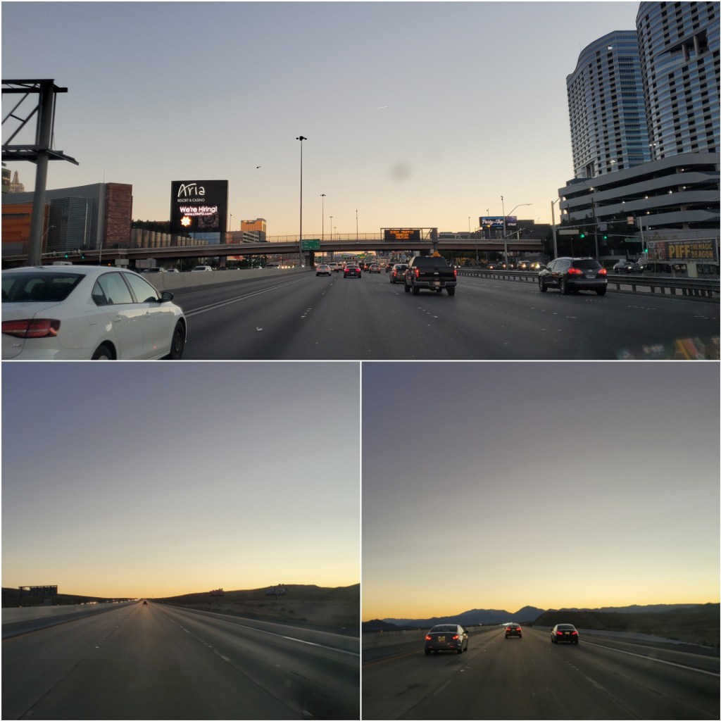 First was after spending all night by walking the entire strip and I was a shot-gun so half sleeping :). Second was the time when the entire sceneries was covered with snow. and Last time I was simply driving at night to LA so all I remember is full darkness.