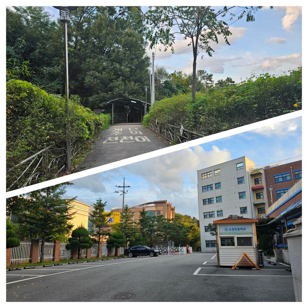덕분에 아 진짜힘들어 하는 순간 언덕 꼭대기에 있는 본가 뒷편의 용인시 수지구 기흥구 전체에서 제일 공기 좋은 학교인 소현중 소현초에 다다랐다…(이것도 코메디하면 붙어있는 두 학교는 둘다 대부분 수지구 지역 학생들이 다니는 듯한데 중학교는 언덕피크쪽 넘어에 있다는 이유로 기흥구…허나 기흥구로는 길이 없다…ㅎㅎ) 한편 언덕넘어 아파트에서 자라는 학생들은 이 천국의 계단길을 9년동안 걸어다녀야 하는건가하는 슬픈 생각….하긴 나도 대치동에서 삼성역까지 언덕을 6년 걸어다녔다…ㅋㅋ(물론 이 언덕에 비하면야 어주 쉬움…)